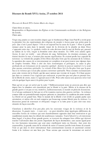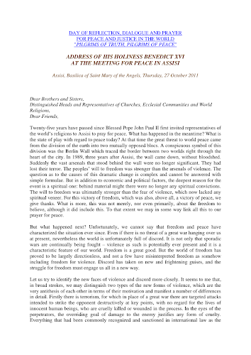 Discours de Benoît XVI à Assise, 27 octobre 2011